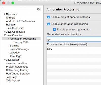 在Mac电脑上建议将自动生成的代码目录建议改为 gen,以避免 Eclipse 找不到代码目录(以点号开头的目录自动隐藏)。查看 Java Compiler \ Annontation Process \ Factory Path ,点击 Add JARs,把 androidannotations-X.Y.Z.jar 加进来。