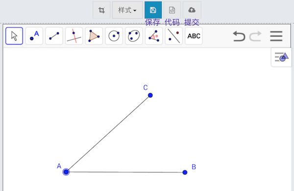 输入合适的宽度和高度后点击“新建”按钮进入下一步的编辑界面。绘制如下图所示的 ∠BAC 的三个点和两个线段,后续闯关任务是作出 ∠BAC 的角平分线。